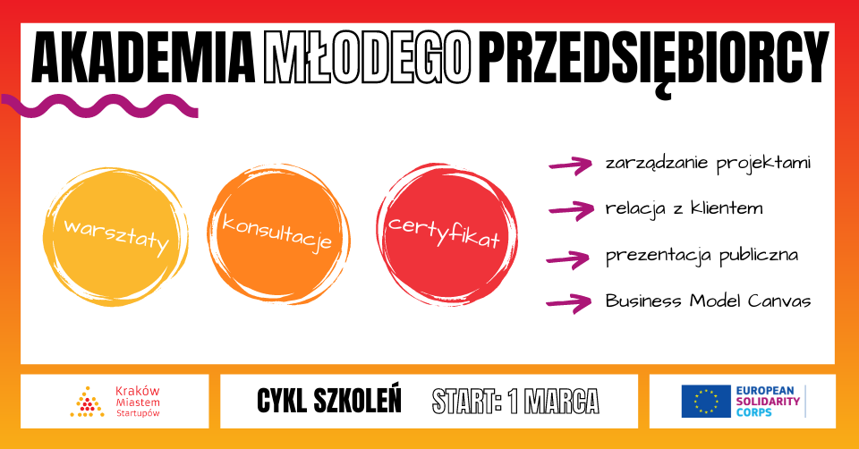 Praktyczny kurs dla uczniów i studentów 4 tygodnie4 webinary4 kluczowe umiejętności biznesowe: zarządzanie projektami relacja z klientem prezentacja publiczna Business Model Canvas (tworzenie modelu biznesowego) Fundacja Kraków Miastem Startupów zaprasza uczniów szkół średnich i studentów zainteresowanych tematyką przedsiębiorczości na cykl webinarów rozwijających kompetencje pozwalające na postawienie pierwszych kroków na drodze do własnego biznesu. Rejestracja:➡ […]